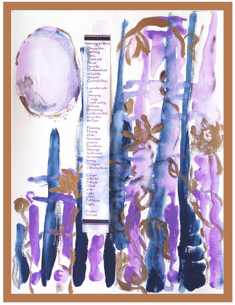Faced with a situation where you have to go back to work or continue to work when you do not want to do so, you may consider this painting.  It speaks of the unexpected beauties and lessons you may find there if you are open to them.  Read the poem and sit with it.  Allow yourself to be in  "Know Nothing Mind"  that doesn't judge but is simply open to whatever may come to you and write it  down.  Allow yourself to look at the picture and absorb its colors and shapes.  Ask any