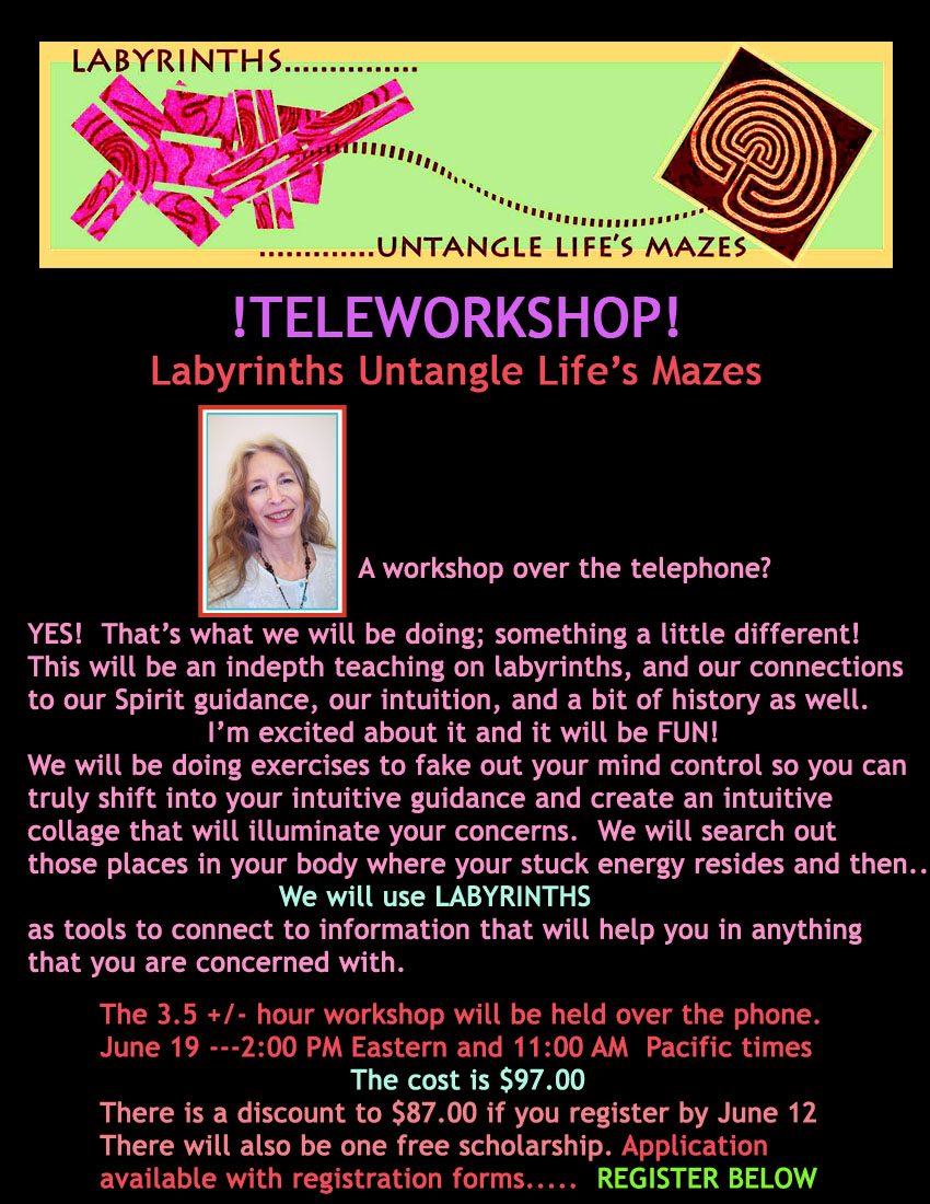 An indepth Teleworkshop on labyrinths to create a stronger connection to your Spirit Guidance and your intuition using art, body notes and labyrinth meditation.